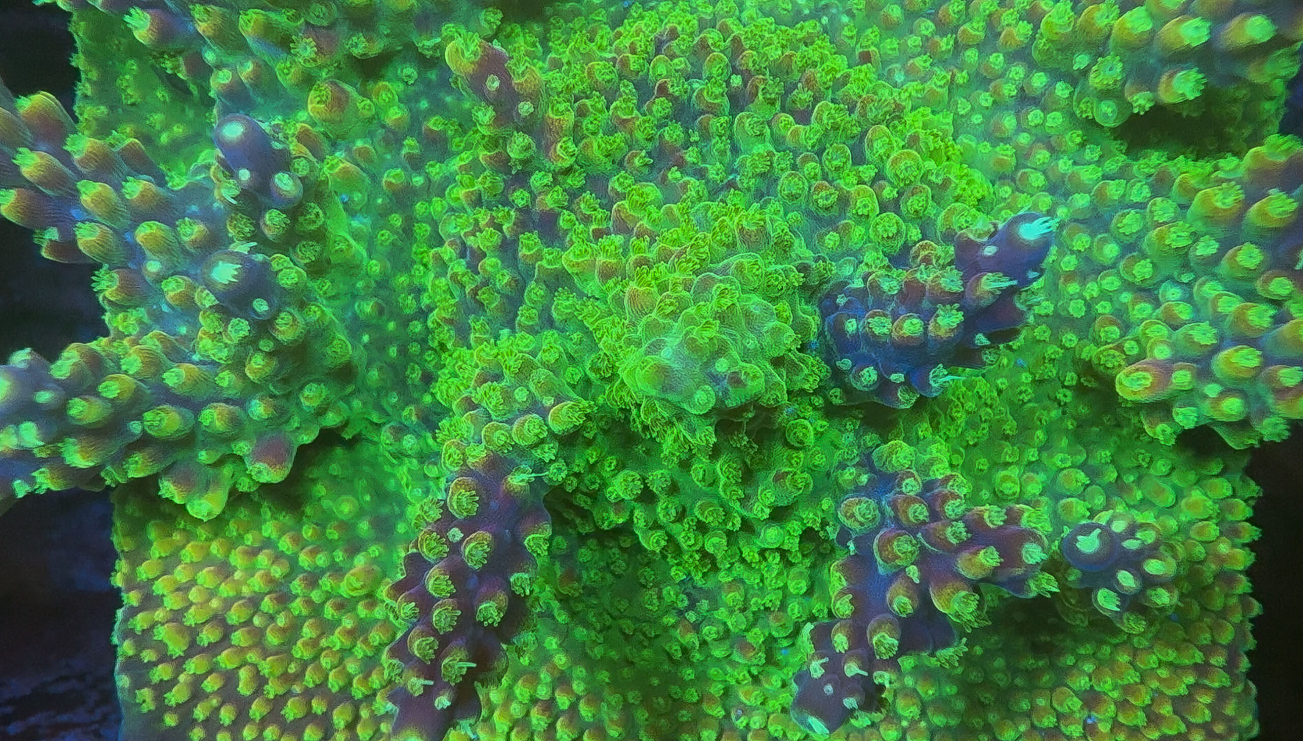 Elegant and electric! This Acro features teal to green base topped with glowing purple to pink tips. A refined splash of colour for any SPS lover. With good lighting and stable parameters, the colours really shine — a rewarding piece for growing reefers.